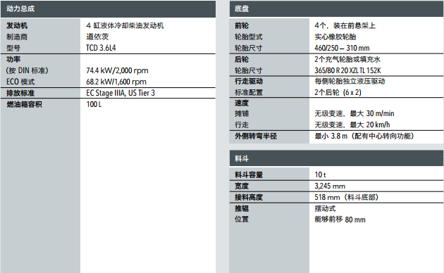 最大攤鋪寬度:4.2 m 運輸寬度:1.85 m 最大攤鋪能力:200 t/h